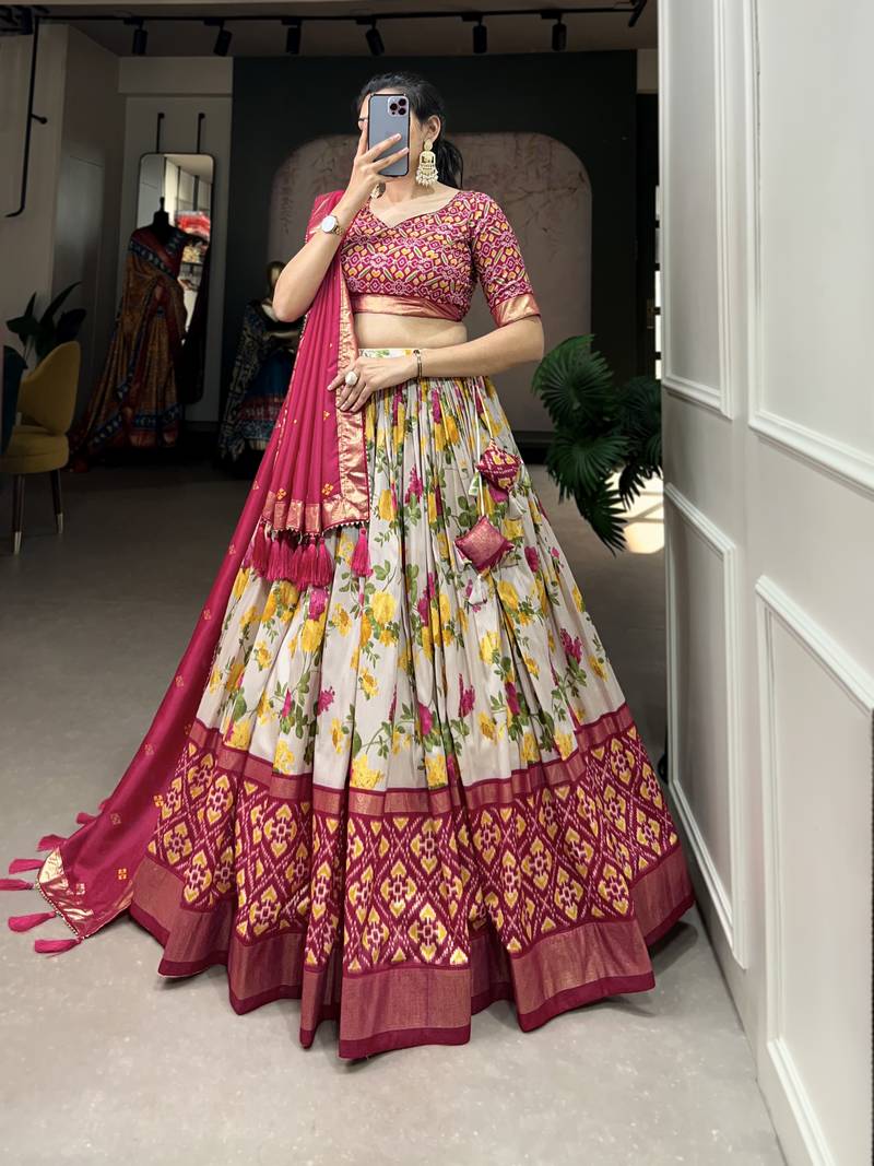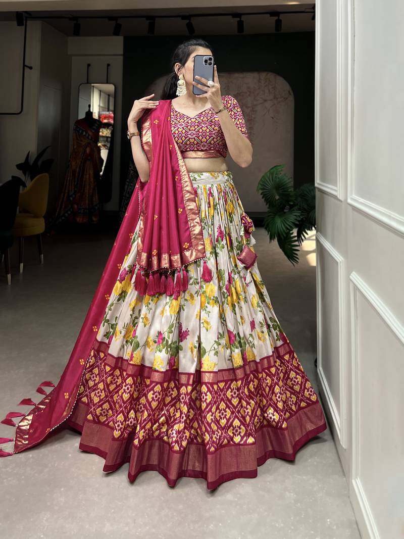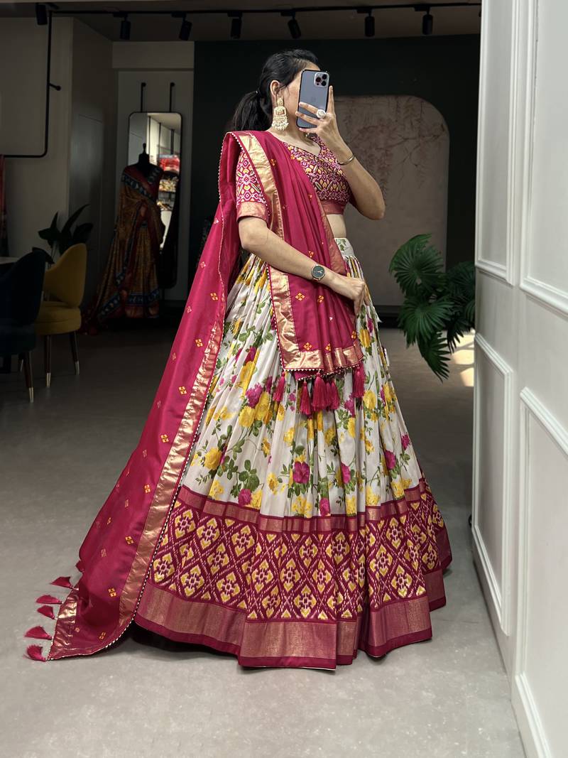 Our festive look with our enchanting Blue & pink patola printed tussar silk lehenga choli. This stunning set features a white and pink tussar silk lehenga adorned with intricate floral and patola prints along with foil work.
