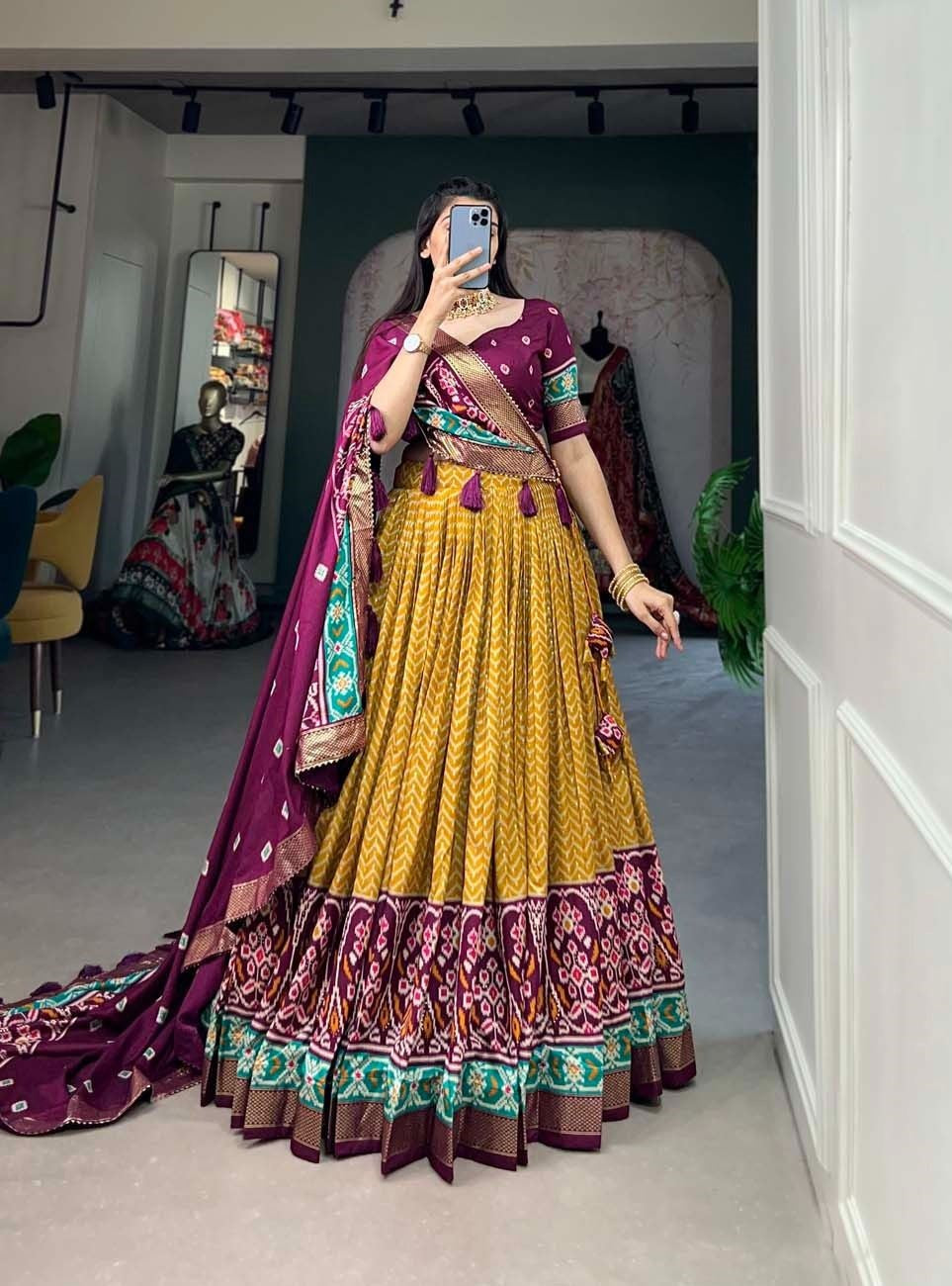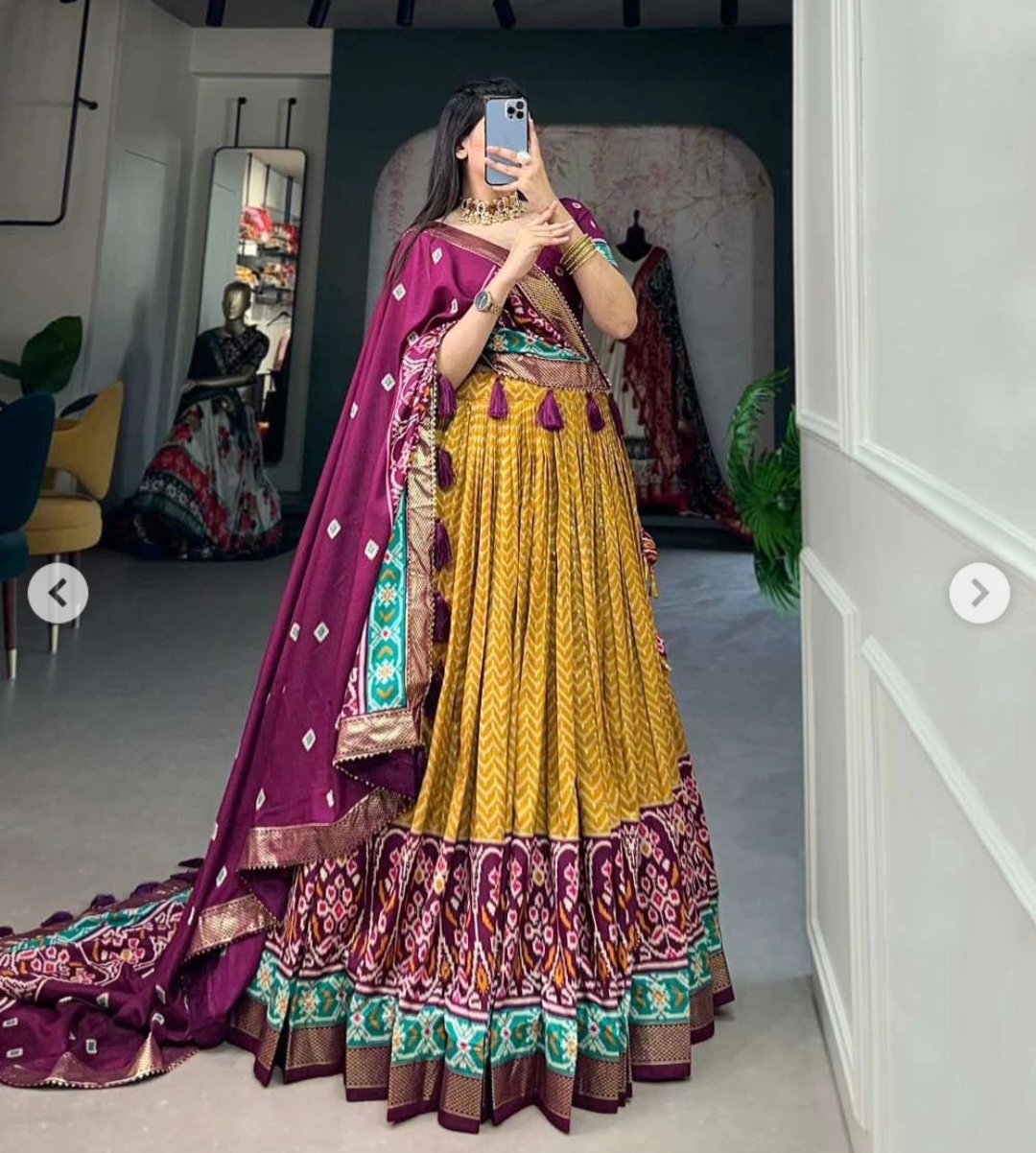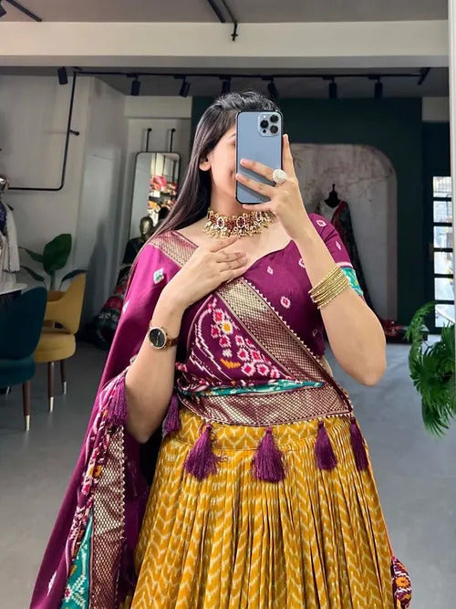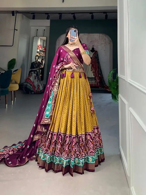 Introducing the epitome of elegance and grace - the exquisite tussar silk lehenga choli ensemble adorned with intricate patola motifs and foil prints.