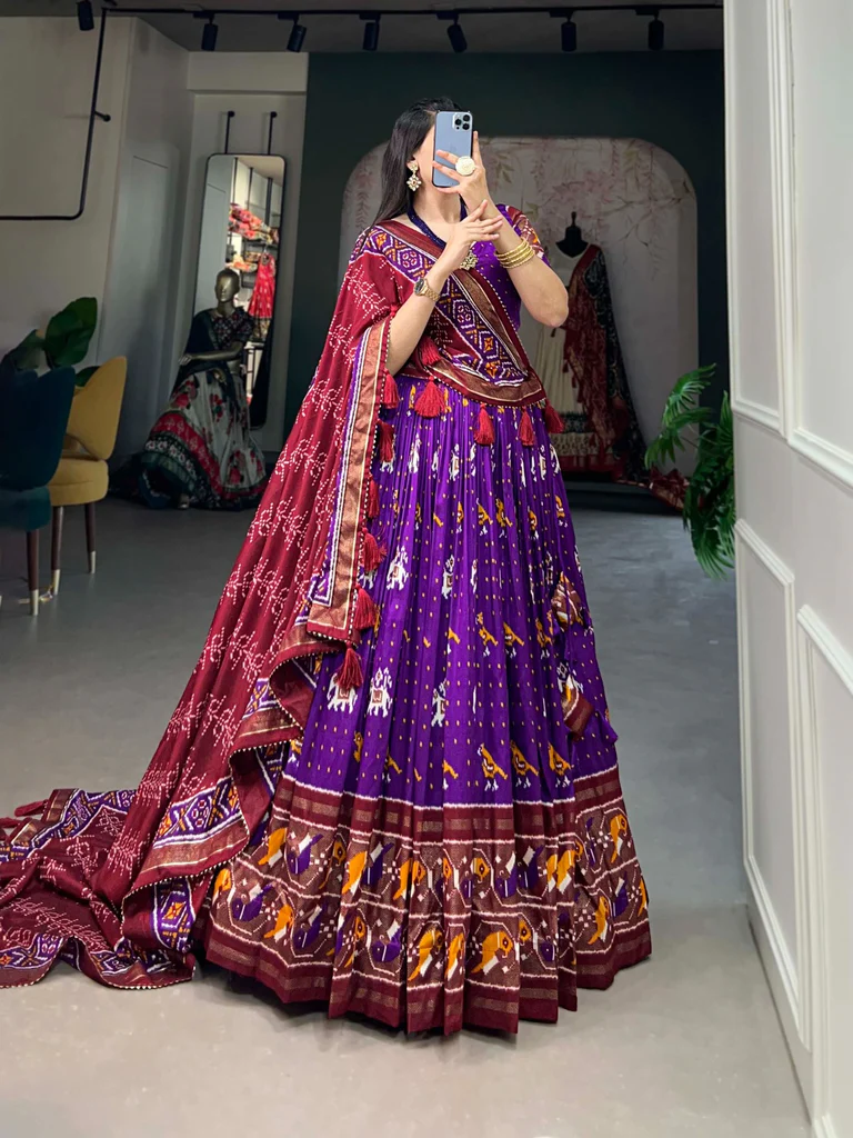 Women's Traditional Wear Tussar Silk Ikkat Patola Print Lehenga Choli Set.